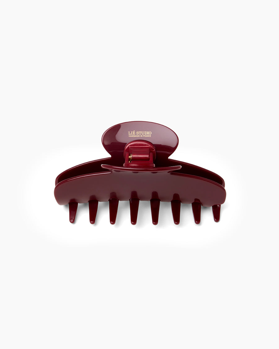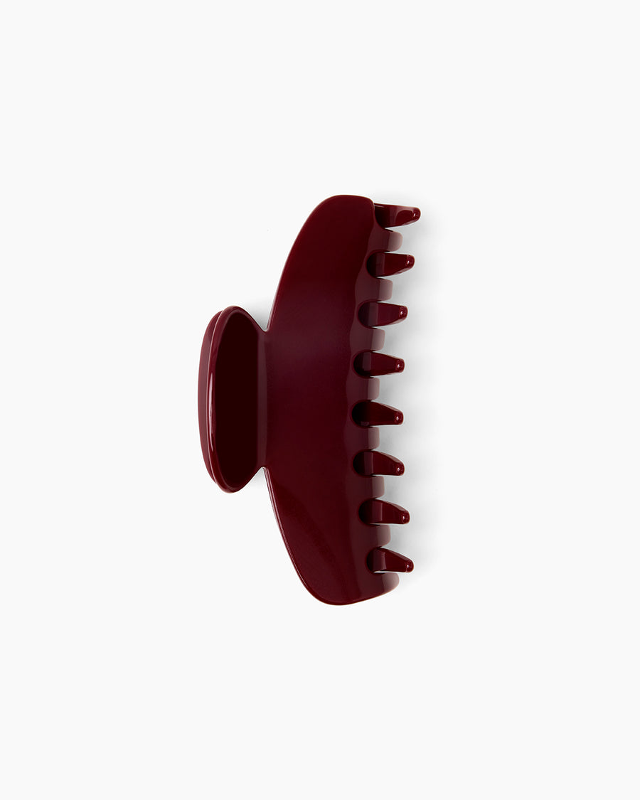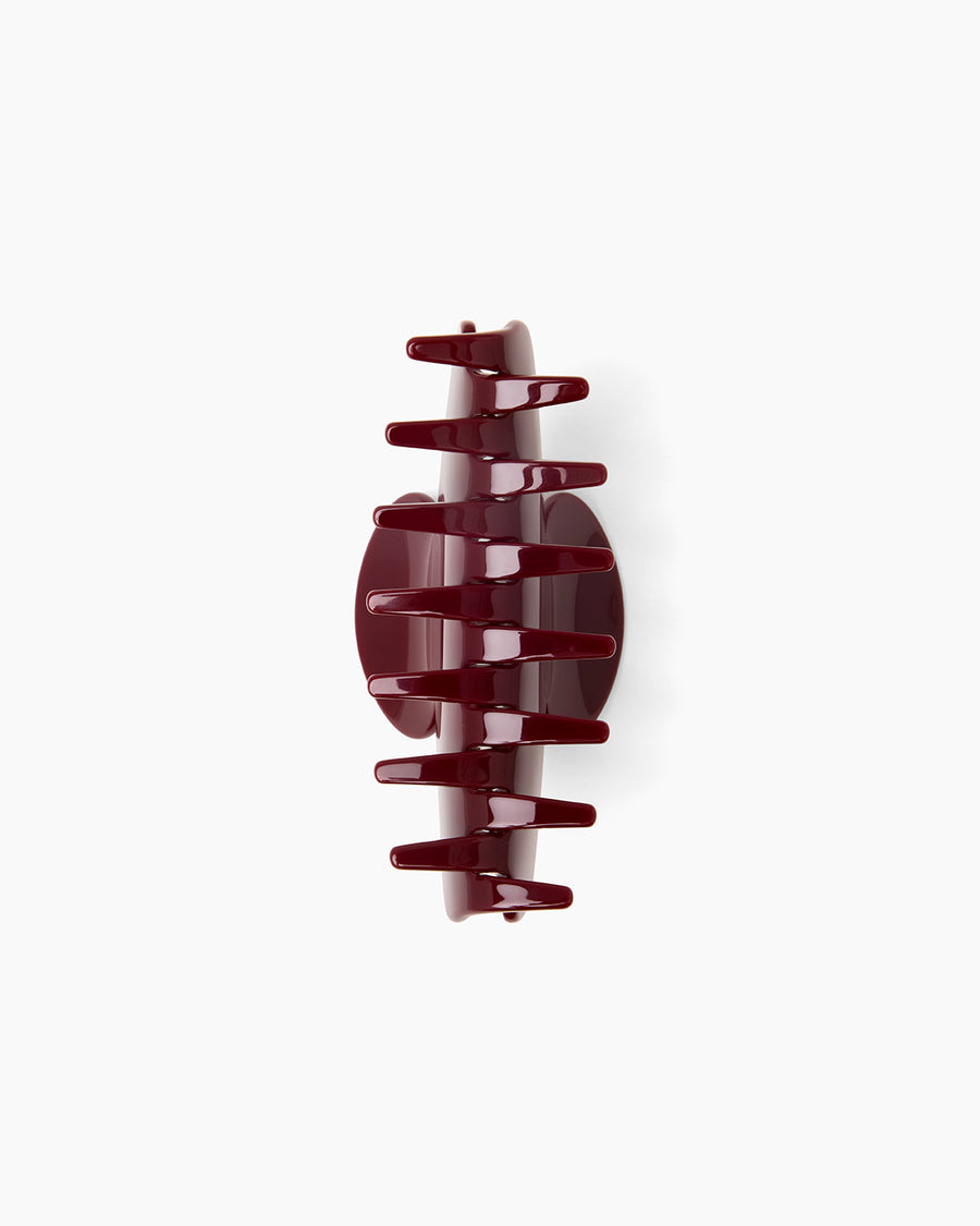 A refined essential for effortless styling. The Faye Hair Clip in burgundy acetate offers both functionality and refined simplicity, and its form is designed to secure the hair with ease while maintaining a sense of understated elegance.